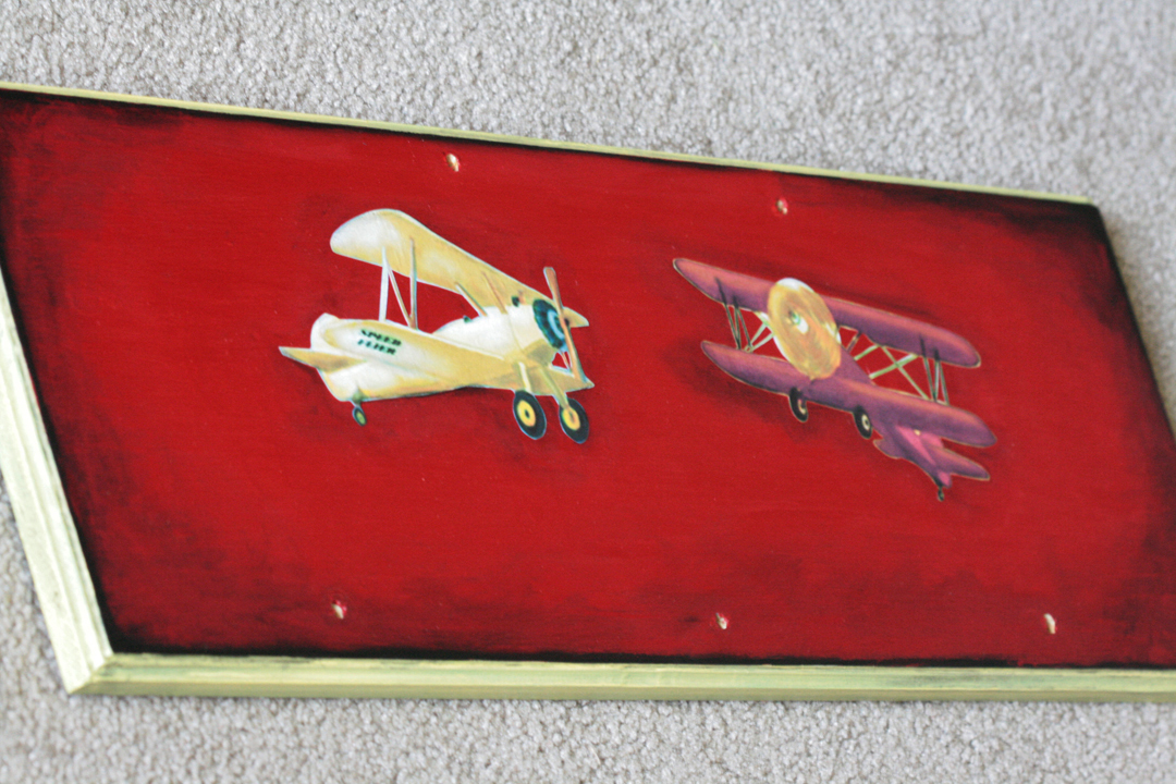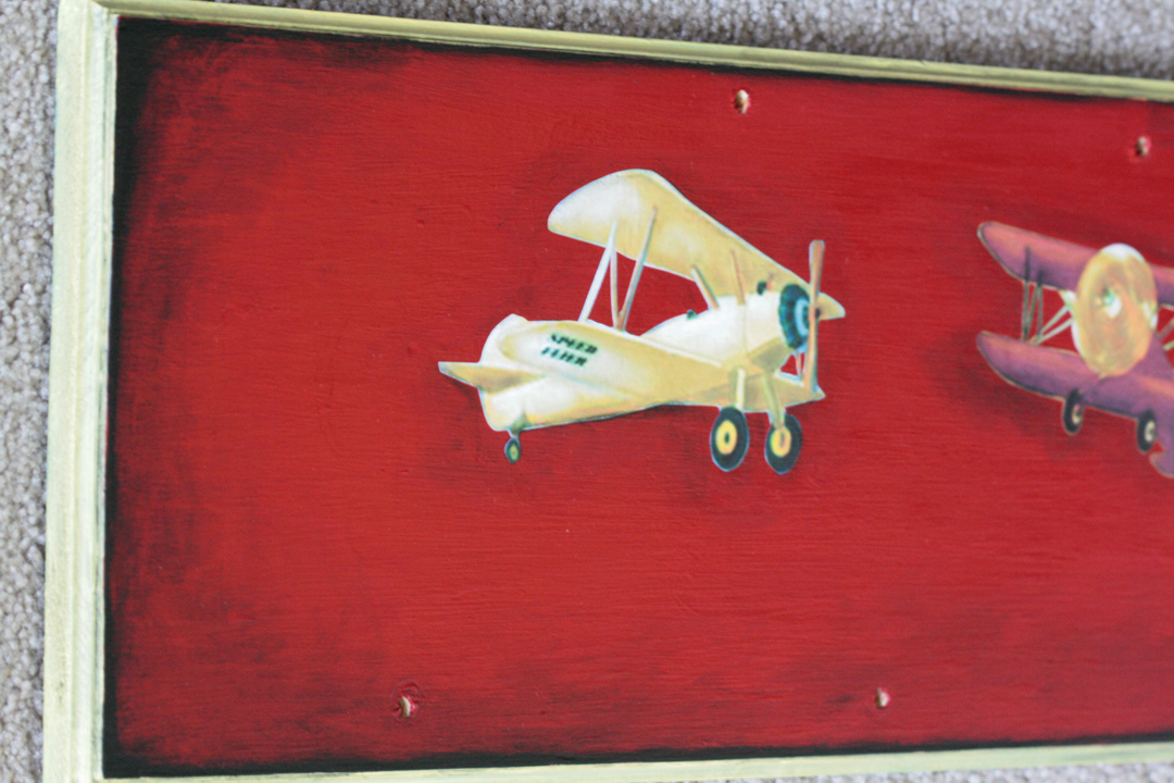 I used 2 biplanes as the background. I printed them large, cut them out and mod podged them on. I side loaded my paint brush (side loaded is when you wet your brush and drag half of the brush hairs through the paint and the other half is just water), with black and worked a dark border around the outside. I then watered down the black paint and brushed it around the inside of the border. I used a paper towel to mute and lift the paint, which gave it a old worn look. I used the watered down black paint over the yellow and then wiped it off before it dried. The black paint made everything come together.