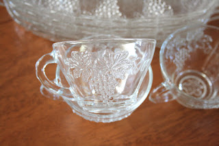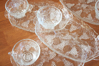 Today I am sharing a Vintage Tea Set, It is very sweet and handy for a tea gathering. It has grapes and vines in molded glass trays and cups. The cups sit in the plate/tray for easy serving of your favorite cakes and breads. Vintage set in original box. 8pc.set 4 cups, 4 plates